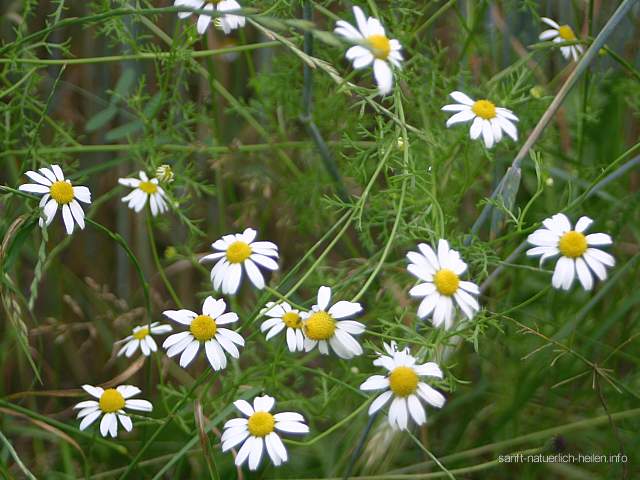 Echte Kamille (Matricaria chamomilla) – stammt ursprünglich aus Süd- und Osteuropa sowie Vorderasien. Heute ist die Echte Kamille in ganz Europa, Nordamerika und auch in Australien eingebürgert. Es ist eine alte Heilpflanze, die antientzündlich, krampflösend und antibakteriell wirkt. Vor allem wird die Pflanze bei Magen- und Darmbeschwerden sowie Entzündungen genutzt. Zu ihren Hauptinhaltsstoffen gehören ätherische Öle, Flavonoide, Schleimstoffe, Cumarine, Lipide, Phytosterole, Terpenoide und Polysaccharide. Für Heilzwecke werden die Blüten der Pflanze genutzt. In der traditionellen Medizin wird die Echte Kamille für Heilzwecke verwendet, unter anderem als Bestandteil von Rezepten bei allergischer Hautentzündung, bakteriellen Hauterkrankungen, Bauchspeicheldrüsenentzündung, Brustzysten, Dickdarmentzündung, Fettleibigkeit, Gewöhnliche Akne, Harnwegsinfekt, Haut- und Schleimhautentzündungen, Hexenschuss, Heuschnupfen, Magen- und Darmbeschwerden, Menstruationsbeschwerden, Mundgeruch, Rosazea, Scheidenpilz, Störung der Darmflora und weiteren Erkrankungen.