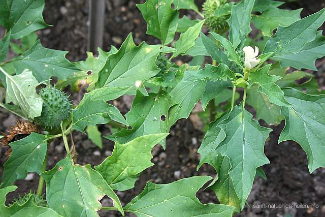 Gemeiner Stechapfel (Datura stramonium) – auch Weißer Stechapfel genannt – alle Pflanzenteile sind giftig und zum Teil hochgiftig. Der Gemeine Stechapfel kam vermutlich erst im 16. Jahrhundert nach Europa und verbreitete sich dann sehr rasch. Zu den bedeutsamen Inhaltsstoffen des Gemeinen Stechapfel gehören giftige Tropan-Alkaloide wie Hyoscyamin/Atropin und Scopolamin. In der traditionellen Medizin wird die Pflanze für Heilzwecke verwendet, unter anderem als Bestandteil von Rezepten bei Asthma, Krampfhusten, Keuchusten und inneren Erkrankungen mit vegetativer Verstimmung, hat jedoch heute an Bedeutung verloren. Auch diente die Pflanze der Erzeugung von Präparaten mit berauschender Wirkung.