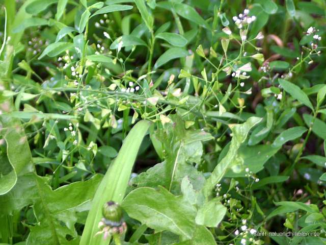 Gewöhnliches Hirtentäschel (Capsella bursa pastoris) – auch Hirtentäschelkraut, Taschenkraut, Schneiderbeutel, Schinkenkraut, Herzkraut oder Bauernsenf genannt – ist in ganz Europa vorkommend, besonders häufig in Mitteleuropa und eine alte Heilpflanze. Zu den Inhaltsstoffe gehören Aminosäuren, Proteine, Flavonoide, Phenolcarbonsäuren, Kalium- und Kalziumsalze, Vitamin C und terpenoide Verbindungen. In der traditionellen Medizin wird das Gewöhnliche Hirtentäschel für Heilzwecke verwendet, unter anderem als Bestandteil von Rezepten bei Dickdarmentzündung, Endometriose, Mastopathie, Nasenbluten, Wechseljahrsbeschwerden, Regelschmerzen, Unfruchtbarkeit und zur Wundbehandlung. Für Heilzwecke wird das Kraut der Pflanze genutzt.