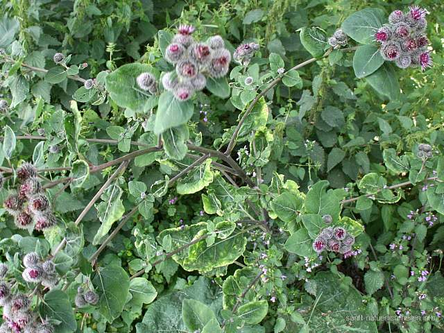 Große Klette (Arctium lappa) – ist überall in den gemäßigten Zonen Eurasiens verbreitet und war bereits in der Antike als Heilpflanze bekannt. Zu den Inhaltsstoffen der Großen Klette gehören Inulin, Fettsäuren und Tannine, Phosphorsäure, fettes Öl, ätherisches Öl, Tannine, Bitterstoffe, Phytosterine, Schleim und Teer. In der traditionellen Medizin wird die Pflanze für Heilzwecke verwendet, unter anderem als Bestandteil von Rezepten bei Blasenkrebs, Colitis, Entzündungen im Mund- und Rachenraum, Gastritis, Gicht, Hauterkrankungen, Nierensteinen, Ödeme, Rheuma und Zuckerkrankheit sowie zur Wundbehandlung. Für Heilzwecke werden die Wurzeln und Blätter der Großen Klette genutzt. Siehe auch: Große Klette (Arctium lappa) – eine alte Heilpflanze