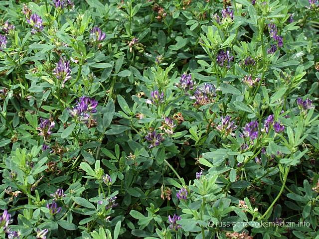 Luzerne (Medicago sativa) – auch Saat-Luzerne, Alfalfa, Schneckenklee oder Ewiger Klee genannt – stammt ursprünglich aus dem südwest-asiatischen Raum. Bereits im Altertum war Luzerne in Persien als wichtige Futterpflanze für Pferde bekannt und ist die älteste Futterpflanze überhaupt. Heute ist Luzerne allgemein in gemäßigten bis subhumiden tropischen Gebieten verbreitet. Zu den Inhaltsstoffen gehören Cumarinderivate, Saponine und Carotin sowie die Mineralstoffe Kalium, Calcium, Natrium und Eisen. Die Samen der Pflanze enthalten die gesundheitsschädliche Aminosäure Canavanin. In der traditionellen Medizin wird Luzerne für Heilzwecke verwendet, unter anderem als Bestandteil von Rezepten bei erhöhten Cholesterinwerten im Blut, Wechseljahrsbeschwerden, verminderter östrogener Aktivität und Arteriosklerose.